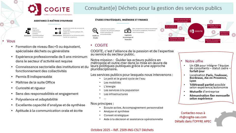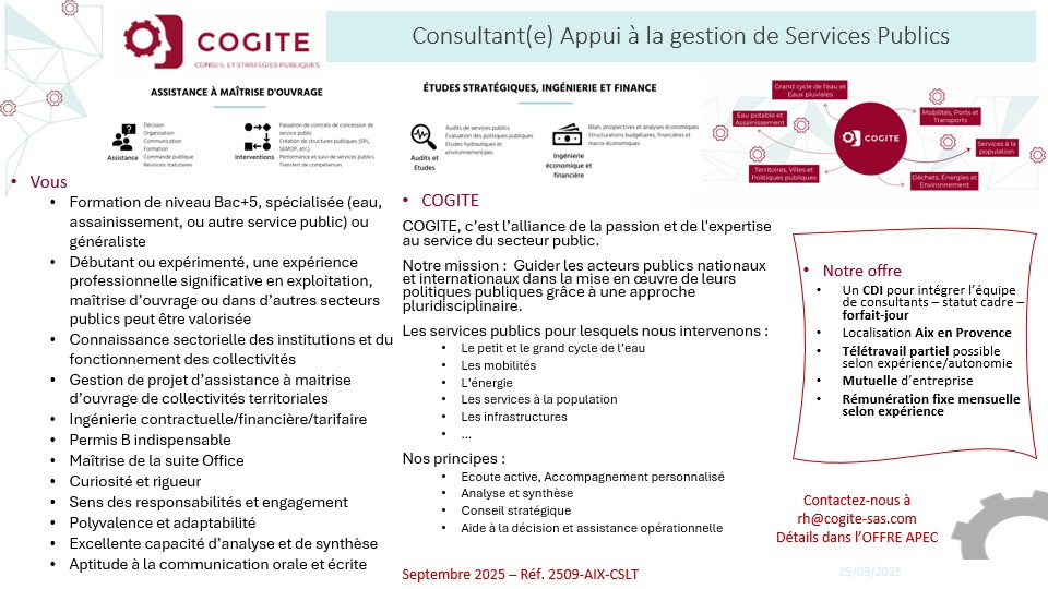 Offre d’emploi : Consultant(e) Appui à la gestion de services publics Lieu : Aix-en-Provence Type de contrat : CDI Description de l’entreprise : COGITE est une société spécialisée […]