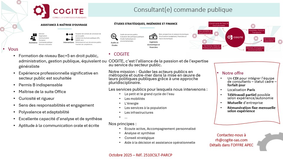 Veuillez envoyer votre CV et une lettre de motivation à rh@cogite-sas.com en précisant “Candidature Consultant(e) commande publique 2510CSLT-PARCP-COGITE” dans l’objet de l’email.