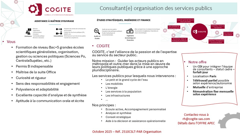 Veuillez envoyer votre CV et une lettre de motivation à rh@cogite-sas.com en précisant “Candidature Consultant(e) organisation des services publics 2510CSLT-PAR Organisation-COGITE” dans l’objet de l’email.